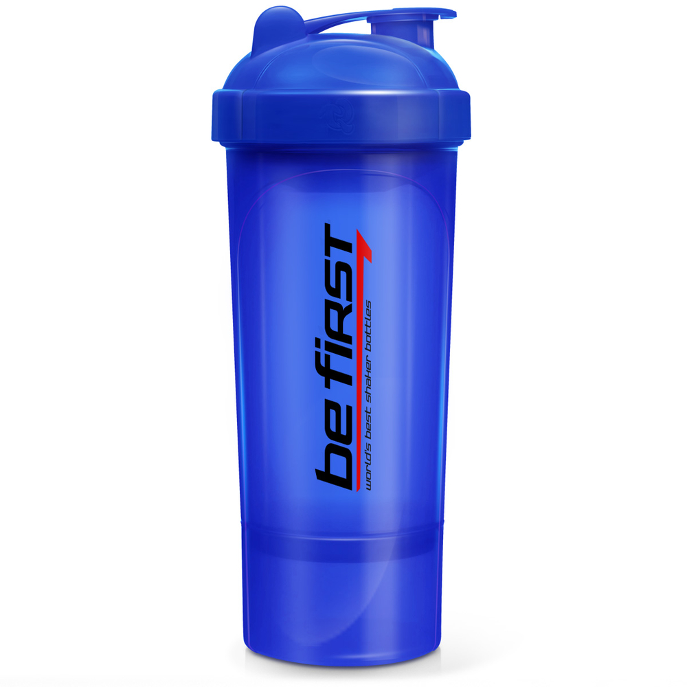 Очень изящный спортивный шейкер Be First удобного компактного размера объемом 350 мл. Корпус тонкий (или, точнее узкий) — даже самой хрупкой даме будет удобно держать его в руке. Полупрозрачный — уровень жидкости будет видно (и для этого есть мерная шкала), а вот что там намешано — останется Вашим секретом. Пластиковых шейкер выпускается в вариантах насыщенных ярких расцветок. Крышка округлая, на резьбе, с удобным небольшим носиком овальной формы. Носик закрывается жесткой защелкивающейся крышечкой, закрепленной на крышке шейкера, так что она не потеряется. Несмотря на то, что носик не имеет резьбы, закрывается он очень плотно — ничего не прольется.