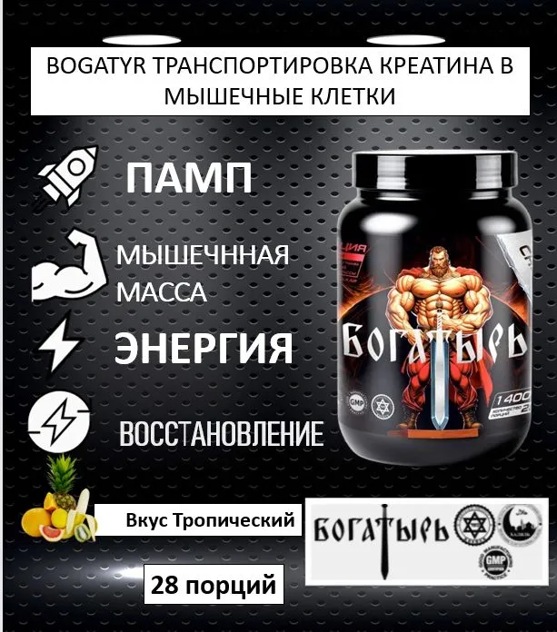 Bogatyr, Переход Креатина В Мышечные Клетки, вкус Тропический микс, 1400 г, (28 порций)