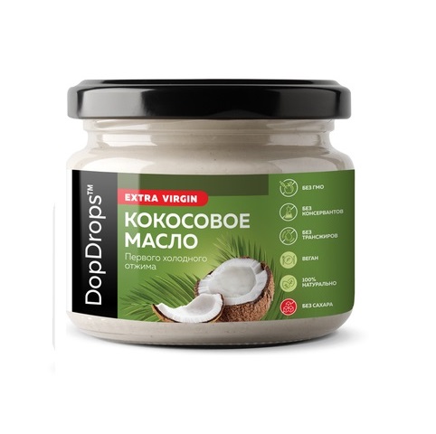 DopDrops TM 100% Нерафинированное кокосовое масло первого холодного отжима Экстра Вирджин 250мл — иделаьный продукт для правильного питания, кето и LCHF диеты который легко купить уже сегодня. Прекрасное дополнение к любому плану питания, нерафинированное масло кокоса DopDrops, несет в себе пользу жиров и минералов с берегов Индийского Океана.