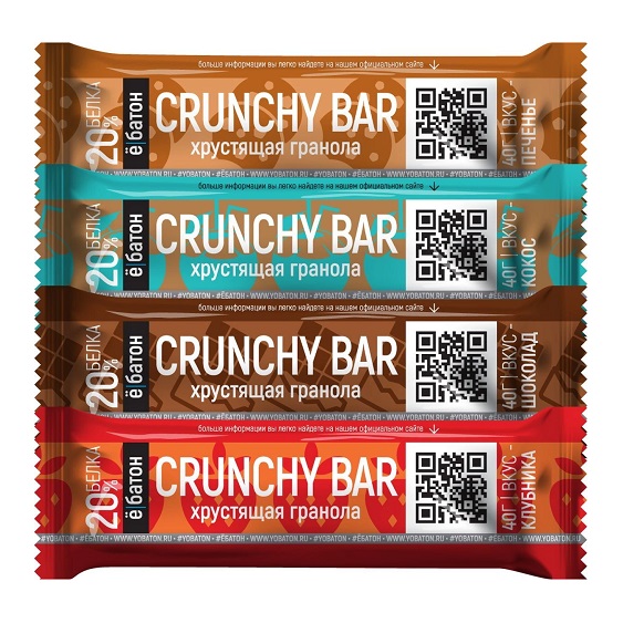 Протеиновые батончики ё/батон CRUNCHY BAR — бесподобный натуральный продукт, который непременно доставит вам удовольствие! Многослойные протеиновые батончики CRUNCHY BAR от ё/батон изготавливаются особым способом, в отличие от многих других протеиновых батончиков, ё/батон CRUNCHY BAR готовятся в несколько этапов, нижний протеиновый слой покрывается слоем гранолы, приготовленной в печи из смеси злаков, а в последствии покрывается глазурью, чтобы сохранить хрустящую начинку.