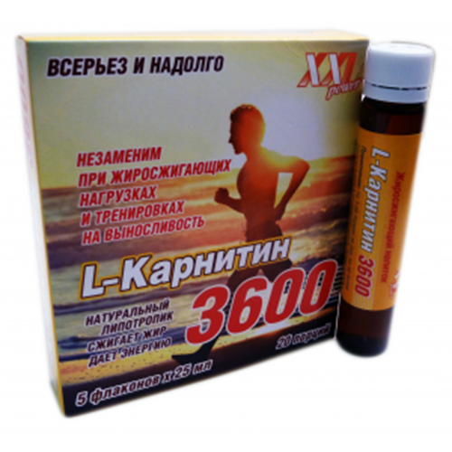 L-карнитин 3600 – это напиток, эффективно преобразующий жир в энергию. Один флакон (25 мл.) содержит 4 разовых порций 900 мг. L-карнитина — основного транспортного агента жирных кислот.