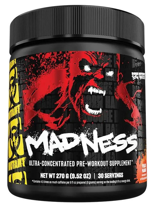 Mutant MADNESS - это предтренировочный комплекс, который предназначен для усиления физического потенциала организма перед тренировкой. Даёт мощный прилив энергии для новых рекордов. Создан на основе аргинина, цитруллина и бета-аланина. Увеличивает выносливость, эффективно борется с усталостью во время тренировки. Разработан специально для супер-интенсивных нагрузок. Входящая в состав предтреника специальная кофеиновая смесь, включает в себя пять источников кофеина, благодаря чему убирает любую усталость и позволяет тренироваться больше и дольше. Способствует производству АТФ - основного источника энергии для работающих мышц. Обратите внимание на противопоказания и проконсультируйтесь с врачом перед использованием продукта. Продукт содержит кофеин, бета-аланин. Не употреблять лицам, не достигшим 18 лет, беременным и кормящим, имеющим аллергию или противопоказания на прием продукта / ингредиентов продукта. Не превышайте рекомендованного количества порций."Внутри продукта находится пакет с влагоудерживающим агентом. Будьте внимательны!"