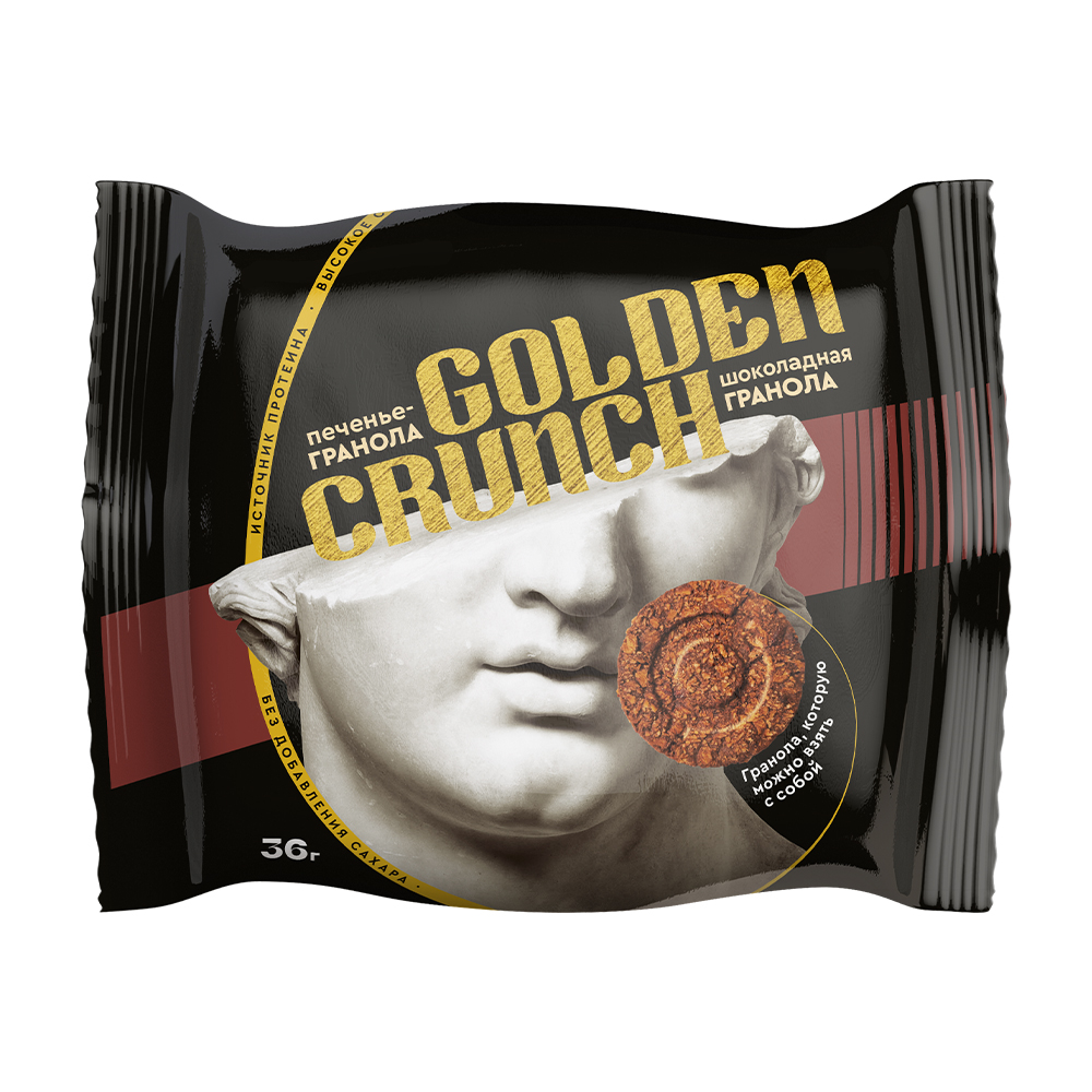 Гранольное печенье Golden Crunch вкус «Шоколад» — это хрустящее овсяное печенье без сахара с добавлением настоящего шоколада.